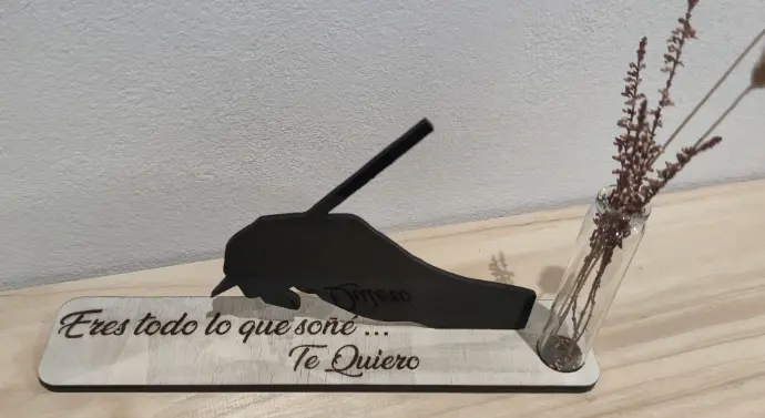 Base de madera con silueta de mano escribiendo en acrílico negro, acompañada de una frase grabada y un pequeño bote de vidrio para colocar una flor o flores secas. Una pieza decorativa, elegante y delicada, que combina arte y significado en un detalle atemporal.