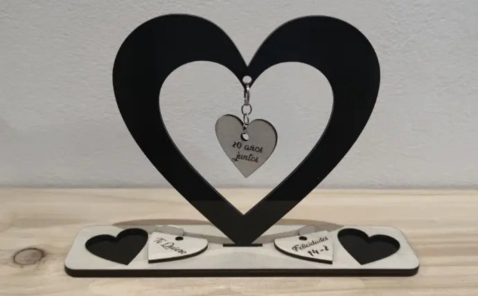 Base de madera con silueta de corazón en acrílico negro y colgante de corazón en madera con frase grabada, incluye corazones intercambiables para personalizar el detalle.