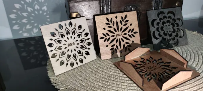Posavasos de madera personalizables, ideales como detalle elegante para el hogar o como regalo para eventos especiales como bodas, cumpleaños o celebraciones. Una opción práctica y única que combina diseño y significado.