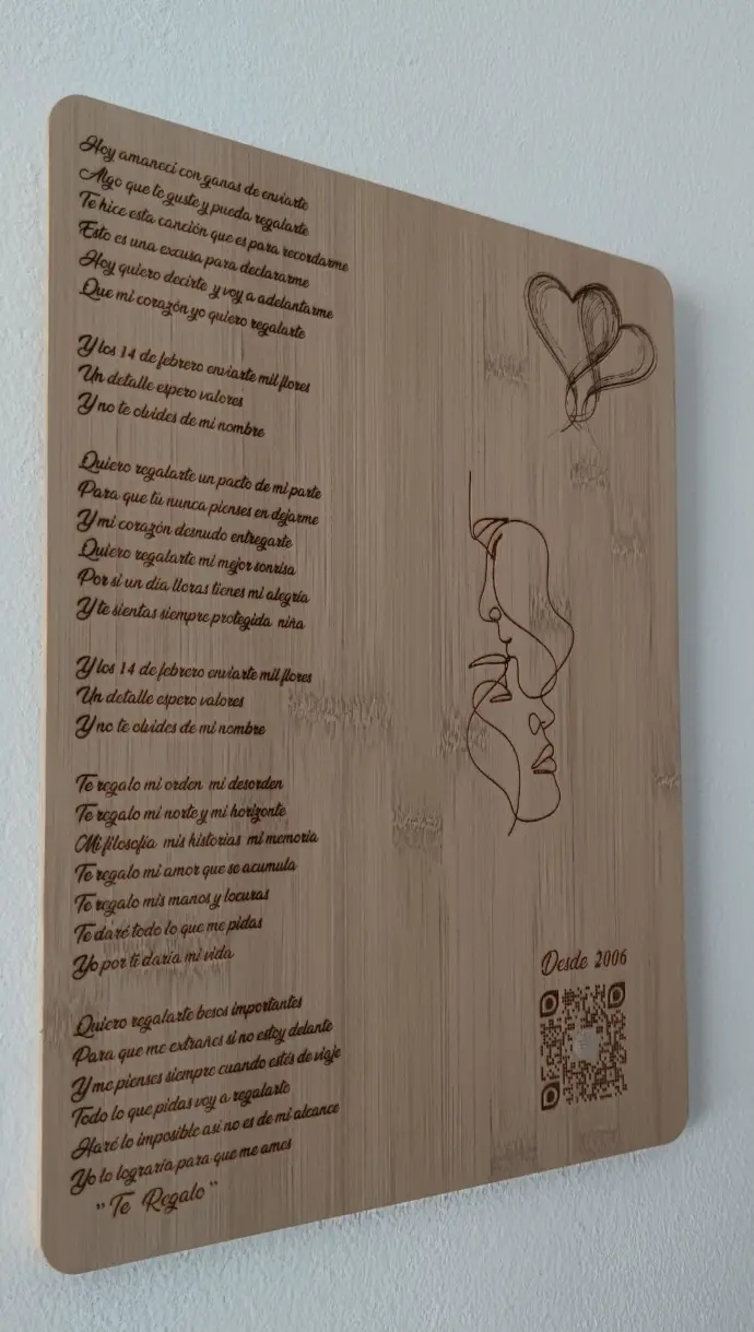 Cuadros de bambú con grabado láser y detalles personalizados, creados para capturar emociones, recuerdos y momentos únicos. Cada pieza combina diseño, arte y significado, convirtiéndose en un regalo o decoración especial que perdura en el tiempo.Cuadro Canción Personalizado