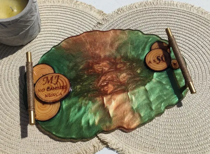 Bandeja elegante de resina con asas en los extremos y detalles en madera para personalización. Ideal como elemento decorativo o práctico, combina funcionalidad con un toque único y personalizado.